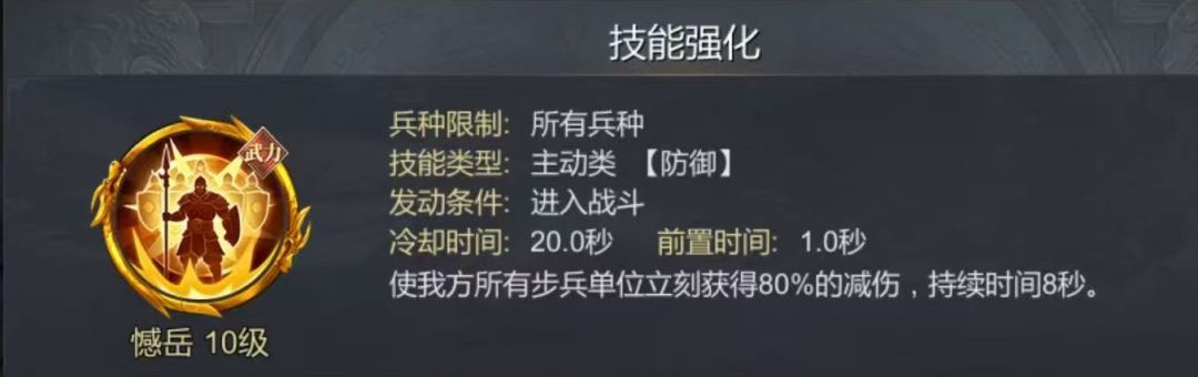 现效果:前置减到3秒,冷却减少2秒,武力伤害变谋略伤害