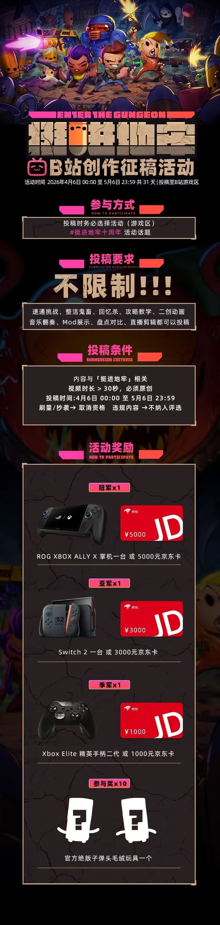 4月6日 0:00-5月6日 23:59,在B站游戏区带话题#挺进地牢十周年,分享与《挺进地牢》相关的原创视频,包括但不限于——