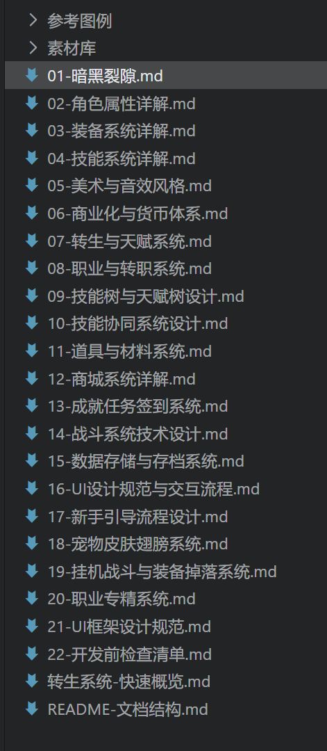 - 本地新建文件夹,写好你这个游戏的策划案,主文件介绍核心玩法(重中之重)、美术风格,然后分文件介绍游戏中的各种功能/系统,做好每个功能的数值。