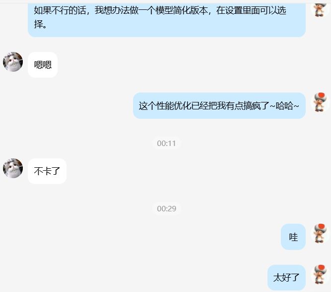 *发现评论区玩家留言说还是卡,吓跑了一早上的胃口,于是痛定思痛,增加了实时判定帧数如果连续3秒检测到在18帧以下,会弹出简化模型提示。大喘一口气,这些手机卡顿虽然解决的不完美,单应该算彻底解决了吧。