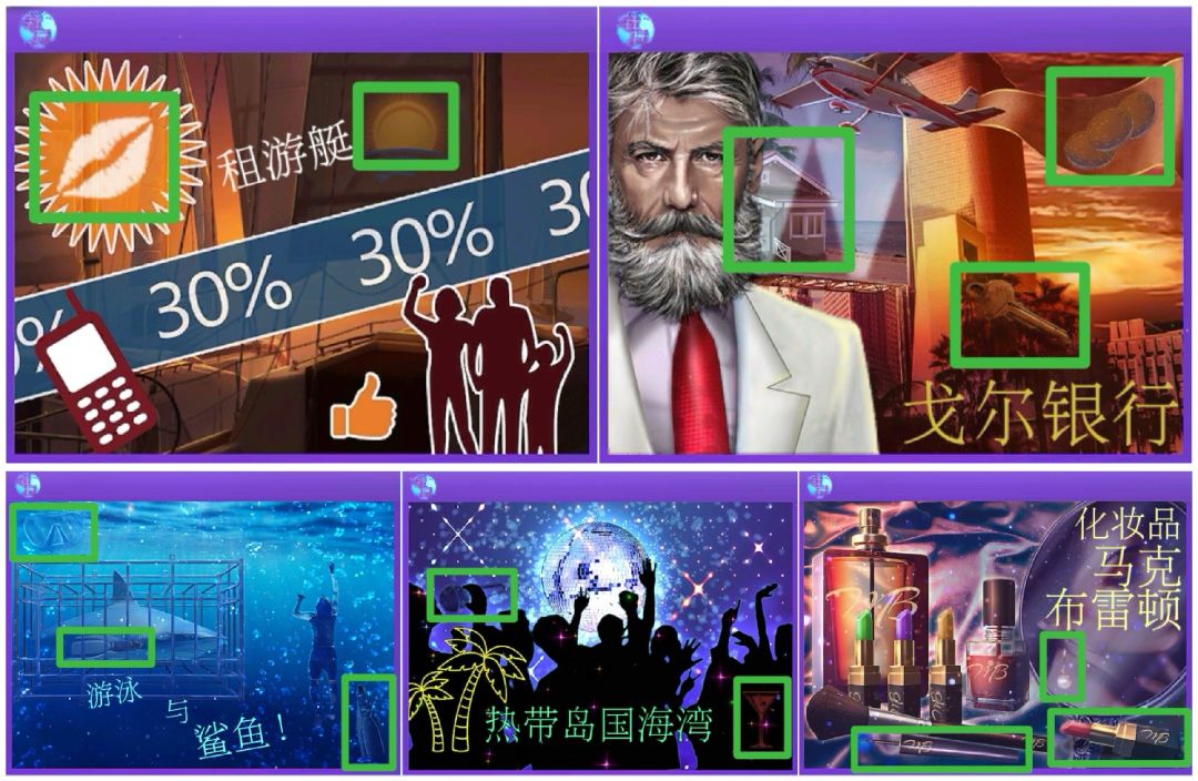 查看半张照片,拼上两张照片,翻转照片,拾取十二个符号。查看相框,使用符号,查看上边两张照片,把第一张照片中的圆圈移到第二张中的圆弧上面,找到8;把第二张照片的账单移到第一张照片的半张钞票右边,找到一张钞票。转动机关,查看右边两张照片,把第二张照片的壁炉移到第四张照片的半颗心右边,找到一颗心;把第四张照片的罗马一号移到第二张照片的X左边,找到Ⅸ。转动机关,查看下边两张照片,把第三张照片的发髻移到第四张照片的盒子上,找到礼物;把第四张照片的光环移到第三张照片的眼睛上,找到一整只眼睛。转动机关,查看左边两张照片,把第一张照片的眼睫毛移到第三张照片的眼睛上,找到一整只眼睛;把第三张照片的半个三叶草移到第一张照片的半个三叶草上,找到四叶草