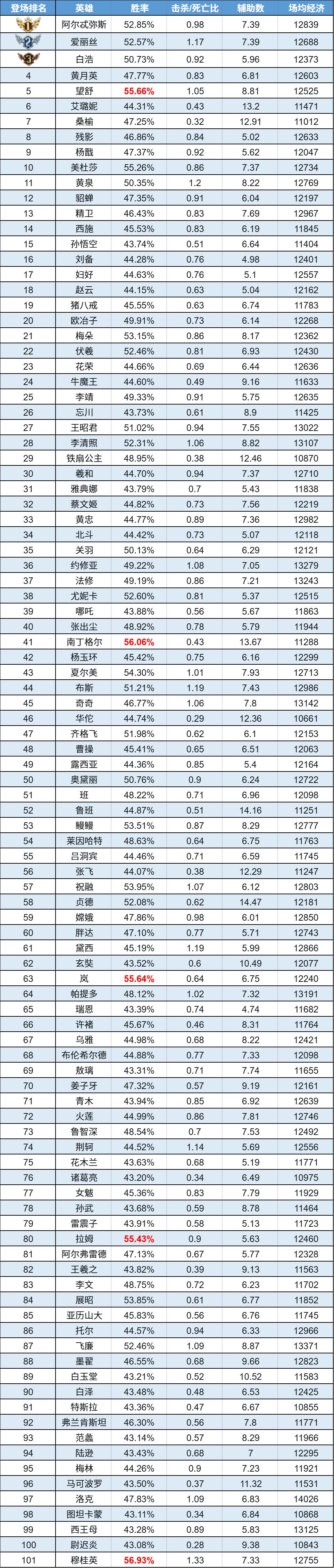 排序:按登场率高低排序,标红为胜率前5