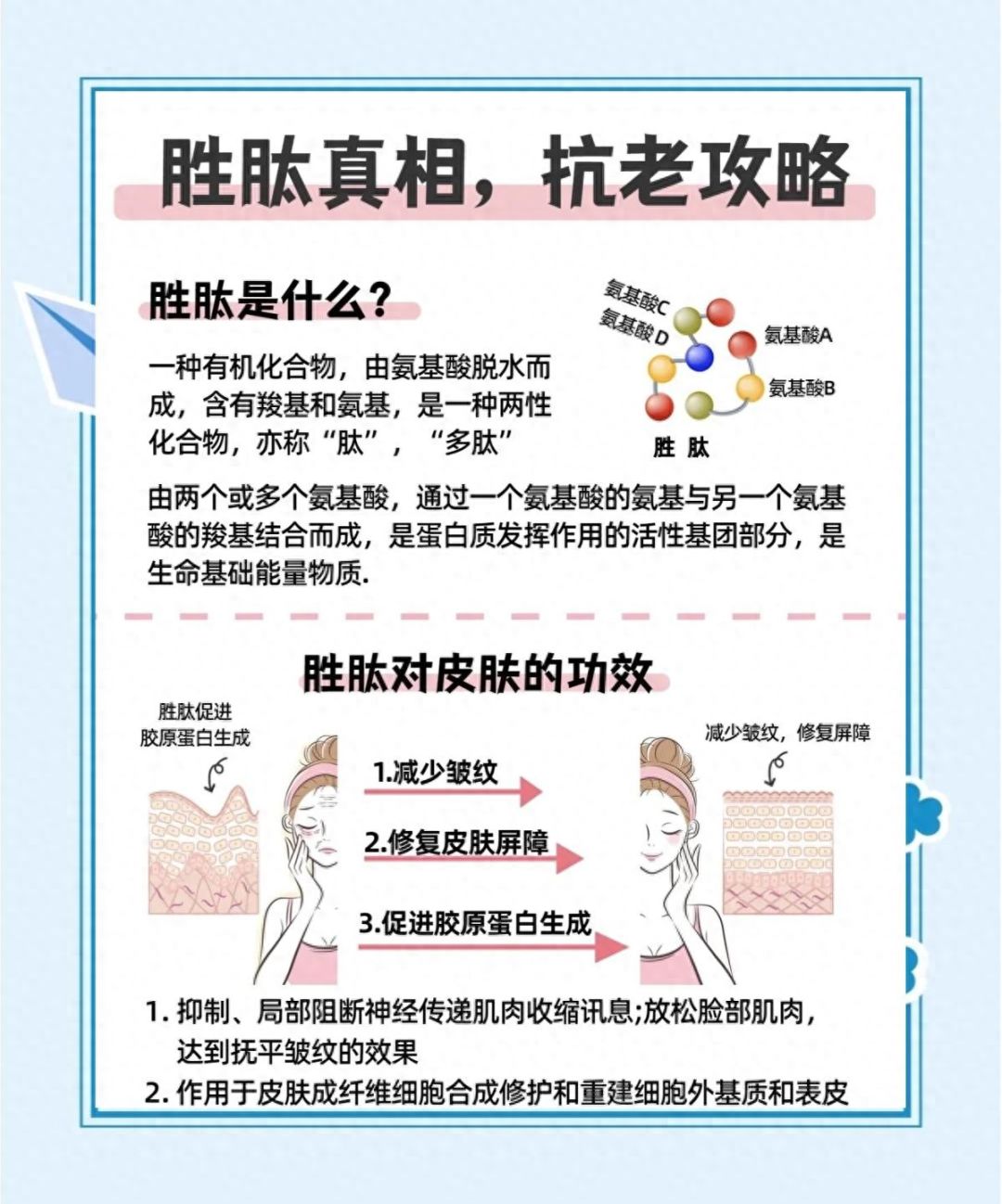 随着年龄增长,很多男生会发现皮肤开始出现细纹、松弛、暗沉。想抗老又怕麻烦,更怕用错产品导致泛红脱皮。胜肽和植物A醇是两种相对温和的抗老成分,适合不想折腾的男生了解。胜肽的作用原理胜肽是由氨基酸组成的小分子蛋白质片段,皮肤中天然存在。它的作用类似于信号分子:当皮肤需要合成新的胶原蛋白时,胜肽会向成纤维细胞传递指令,促使其生成胶原纤维和弹性纤维。这个过程不涉及角质层剥脱,对皮肤屏障的干扰很小。不同胜肽有不同的侧重。有的主要促进胶原合成,帮助改善细纹和松弛;有的可以调节表情肌的过度收缩,对动态纹有帮助;还有的辅助修护皮肤屏障。许多产品将多种胜肽复配,以达到更全面的效果。胜肽类成分的优点是温和、不需要建立耐受、对光和热稳定,白天也可以使用。缺点是起效速度相对较慢,通常需要连续使用两到三个月才能观察到变化。