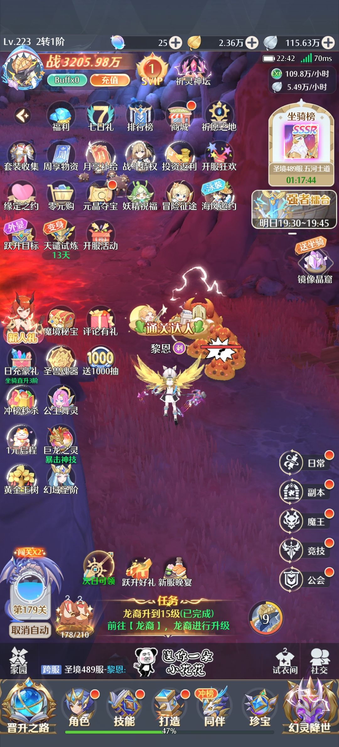 不用任何思考的游戏,闯关就是不停的在跑,碰到小关卡就会跳转到打BOSS界面,然后打完继续跑。偶尔不时的弹出魔龙刷新了,几转的怪物刷新了,然后飞过去开打,还有刷塔,都是闯关,全自动,就是看你战力能不能在规定时间内打完,不然就是失败了。