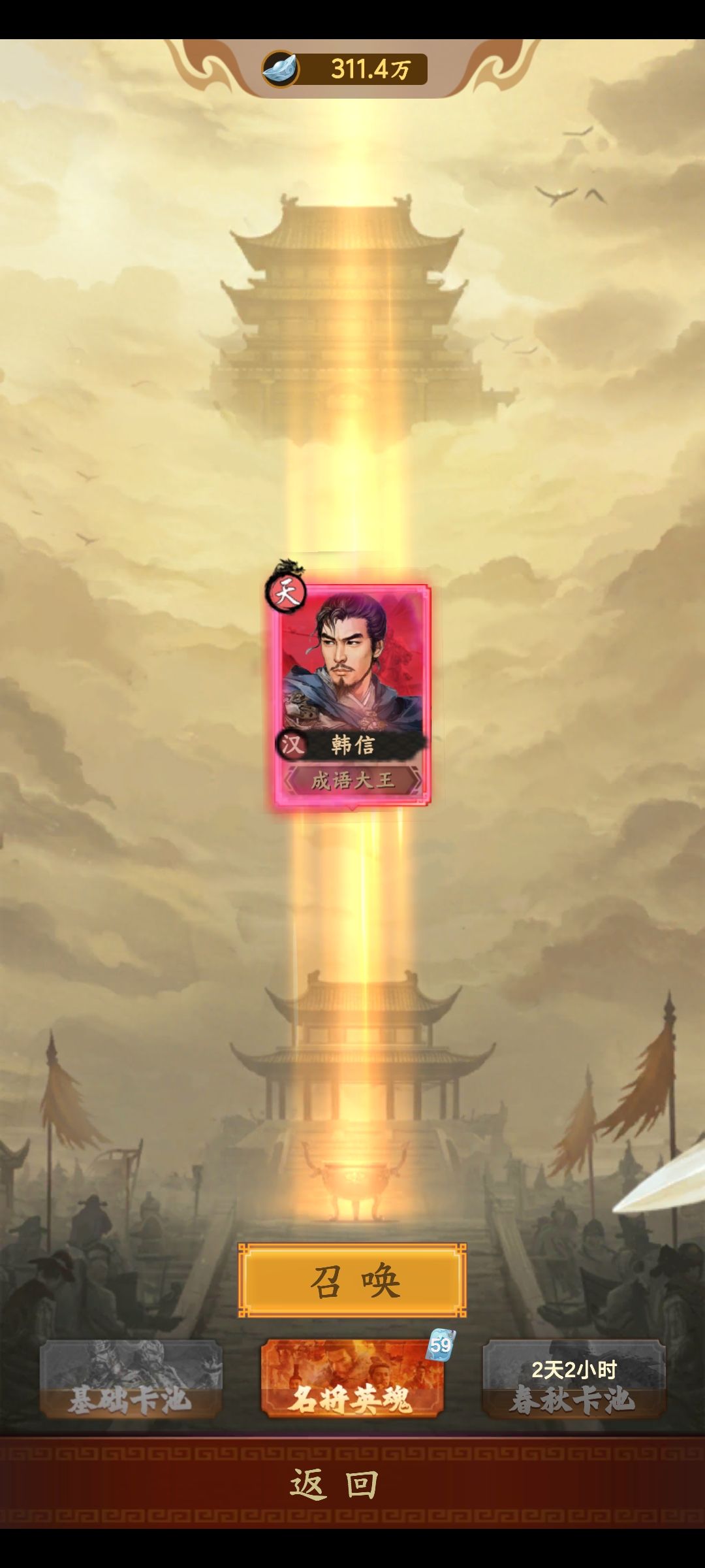 30点国运的恐怖加成,连续两次将魂抽卡,一发入魂出韩信,继续在来一发接着出韩信,两次将魂抽奖两个韩信
