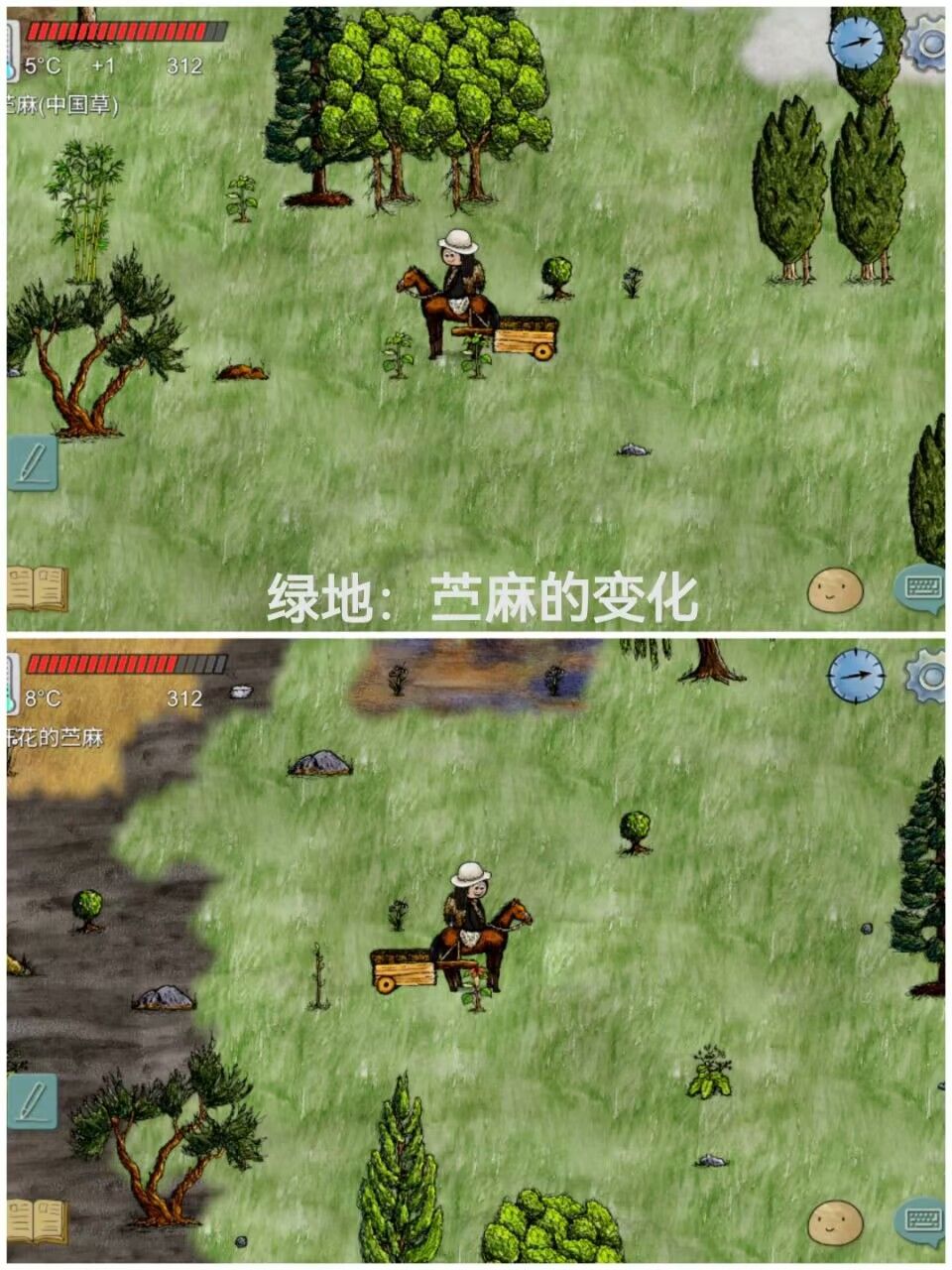 雪地:松树,未经过松树无松针,经过后松树有松针(需要时间:1h)所以只适用于经过雪地区域>1h的状态