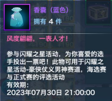 嗯!当获取到投票道具后,大家就可以在比赛期间就可以为喜欢的选手进行投票应援,帮助参赛选手增加票数冲刺活动排名了! 注意了!正式赛期间获得投票道具【蓝色/粉色香囊】,会在7月30日21:00过期,少侠们需要提前送完,别攒到过期!