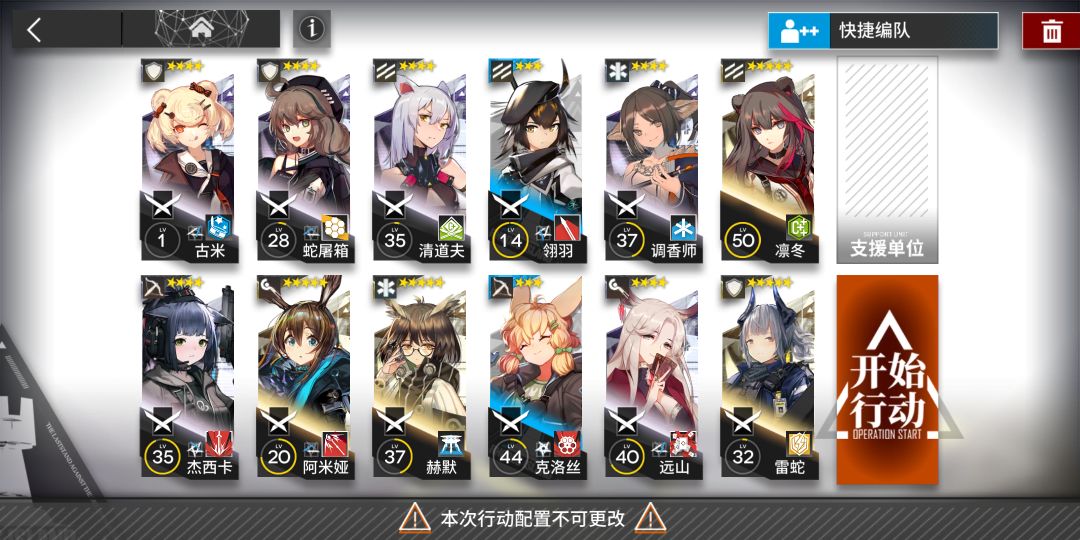 下面尽快在坐左上放防t(输出不够的话最好找能抗四个的,类似蛇屠)然后坐下加一个射手(本人脸黑没有好射手打灰机,只能多带)最后中上放群奶。