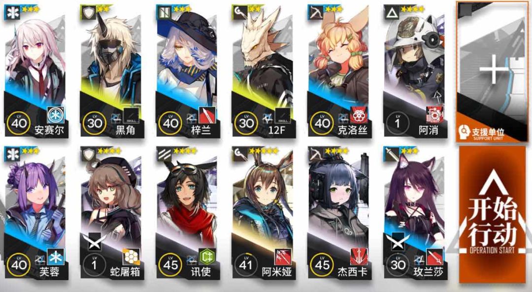 古米×2,砾×1,杜宾×1,阿消×1,玫兰莎×2,芬×1,炎熔×1,芙蓉×2,克洛丝×1,梓兰×2,安塞尔×1,米格鲁×1,黑角×1,12F×4,巡林者×4,夜刀×2,杜林×1